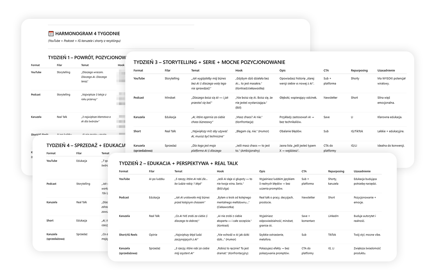 Cztery kluczowe elementy Twojego biznesu przygotowane od A do Z: cel, plan, oferta i strategia treści — wszystko dopasowane do Twojej sytuacji.