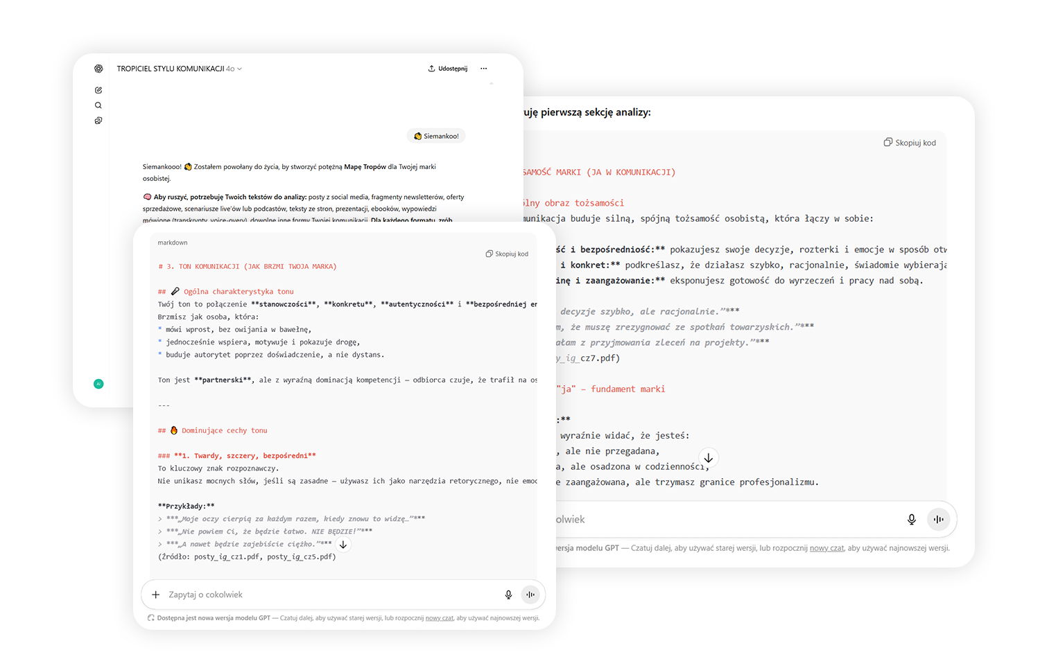 Asystent analizuje Twoje treści i tworzy dokument określający Twój naturalny styl — jak pisać, żeby było spójnie, lekko i skutecznie.