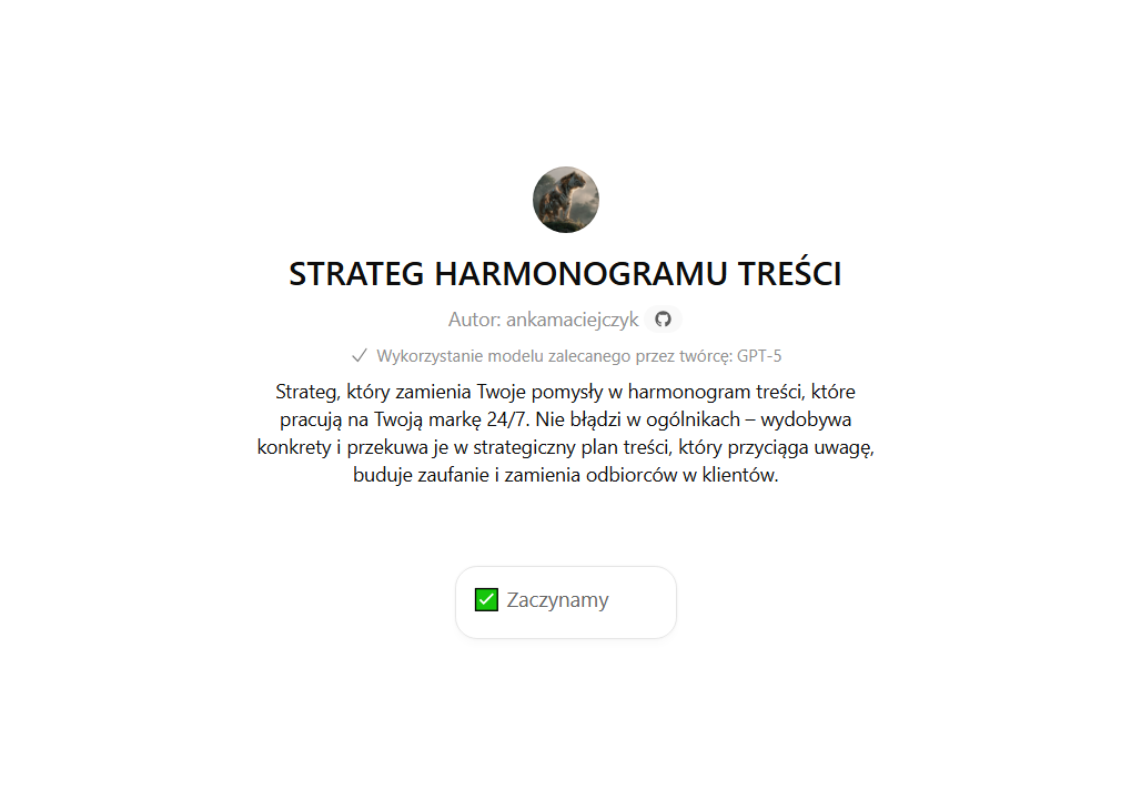 Ten Asystent GPT to Twój prywatny strateg, który zamienia Twoje pomysły w harmonogram treści, które pracują na Twoją markę 24/7. Nie błądzi w ogólnikach – od pierwszej rozmowy wydobywa z Ciebie konkrety i przekuwa je w strategiczny plan, który przyciąga uwagę, buduje zaufanie i zamienia odbiorców w klientów.